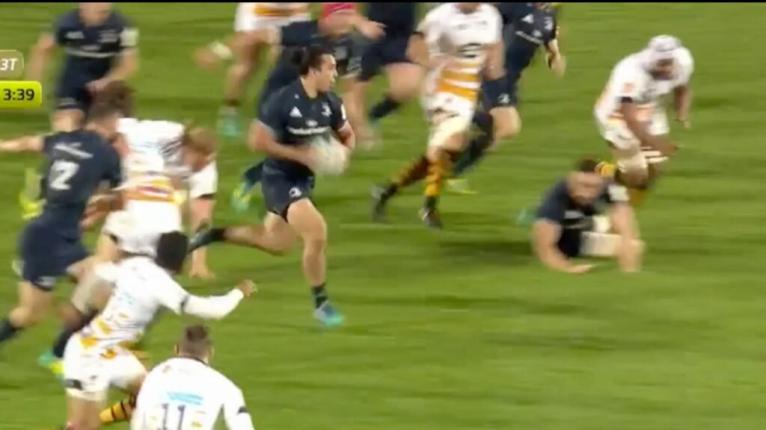He is able to hold off the Wasps defence by looking for support and fend off a last-ditch tackle attempt by Elliot Daly to score next to the posts.