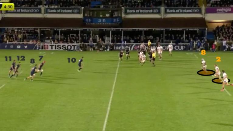 Using the 5-man lineout has dispersed Leinster’s loose forwards, and they have set up with two strong ball carriers, Josh van der Flier (7) and Jack Conan (8) outside Johnny Sexton in a box formation with two backs in behind.