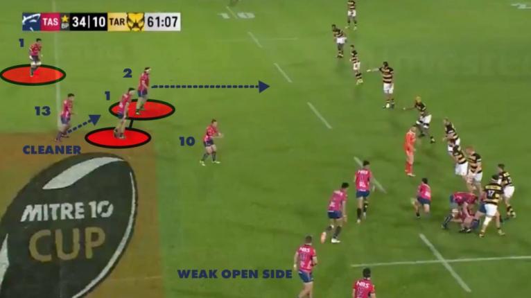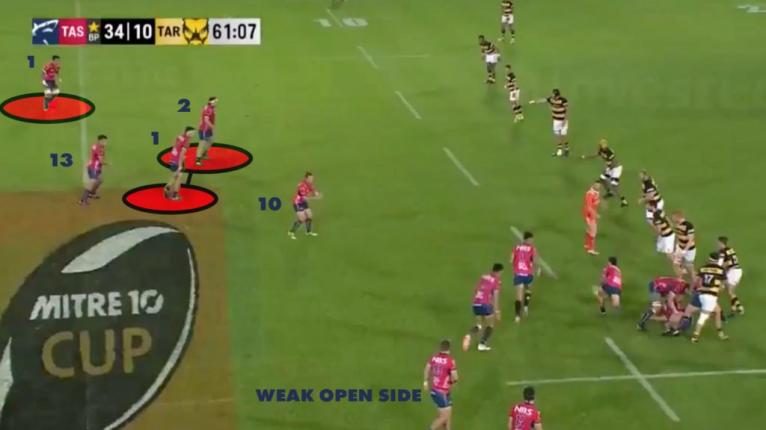 The three-man pod from the ‘strong’ side can re-load and Tasman can switch the point of attack back towards that way with more designed set plays.