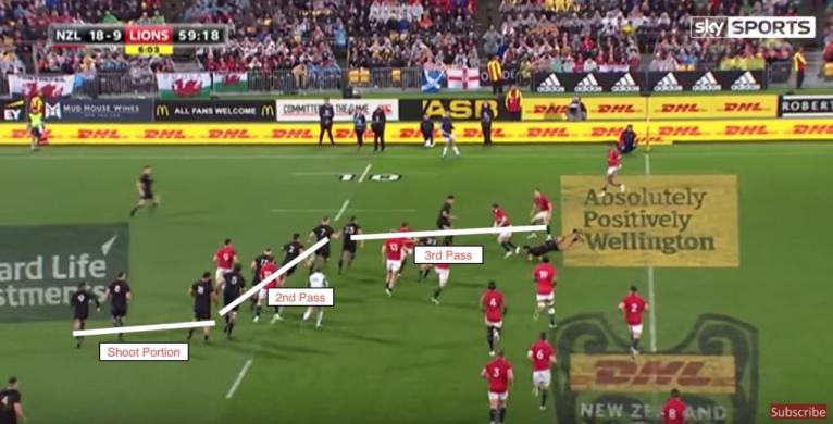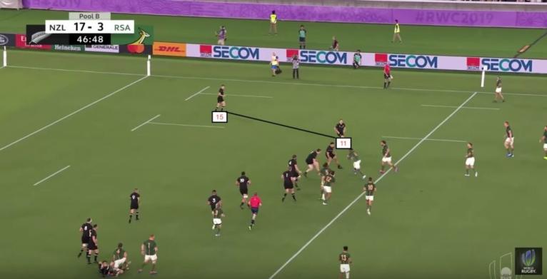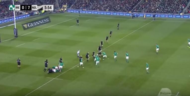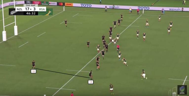To funnel the attack out wide, the defensive line immediately starts drifting the moment the ball has passed each defender. This work-rate, and urgency to get over results in an unlikeliness to outflank New Zealand, though it can happen. There are ways to target this eagerness, one of which was shown by Joe Schmidt.