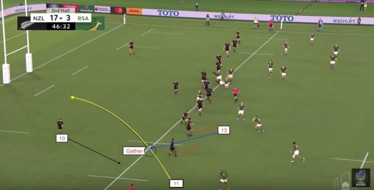 The New Zealand system usually assumes a long pass from 9 means a play is going outside the 10 channels. This is often fair, as long passes that cut out three players or more to the 10 or a distributing forward pod have the ability to initiate the wide play.