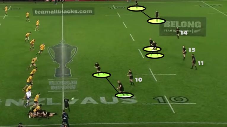 In 2015, Dan Carter was almost exclusively receiving the ball from his halfback at first receiver. To illustrate the rise of the swivel pass and multi-level play, in the third test against France Damian McKenzie had 60% of his touches as a backdoor option.