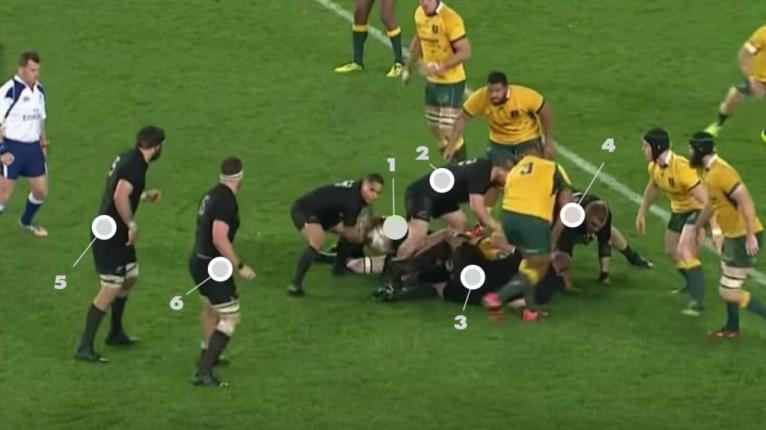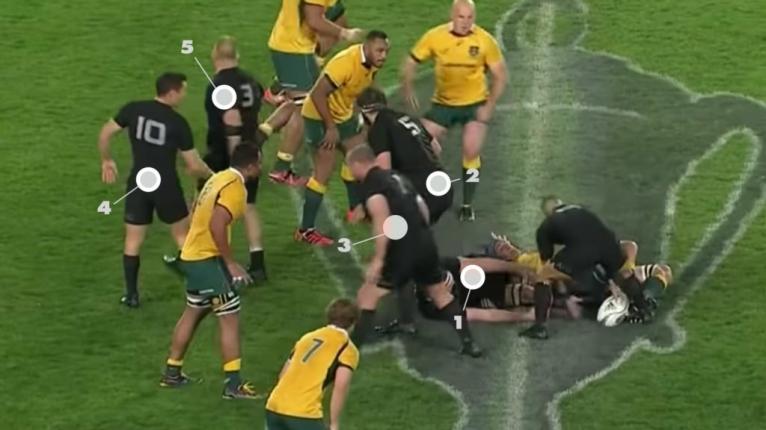 The All Blacks have seven players in this picture, two on the ground, two over the ball, two forwards caught in ‘no mans land’ arriving late to the ruck, and the halfback looking to deliver the ball.