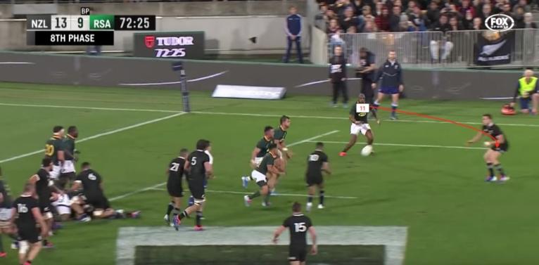 This turnover is off the back of the New Zealand “sweep”, a move that Nienaber clearly targeted as a turnover opportunity due to the isolation it leaves the winger Rieko Ioane in.