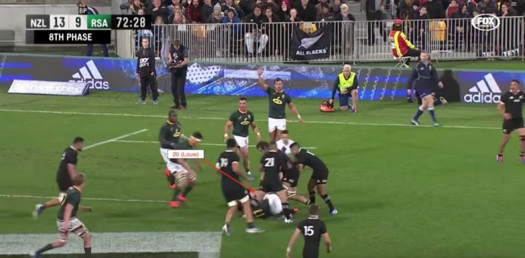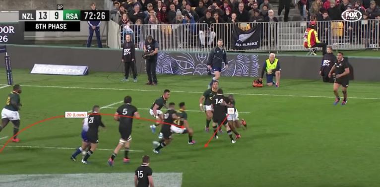Here New Zealand have a man over, which engages Makazole Mapimpi on the close. He shoots up, hitting Ben Smith in the side and pushing him inside, where we can see Louw.