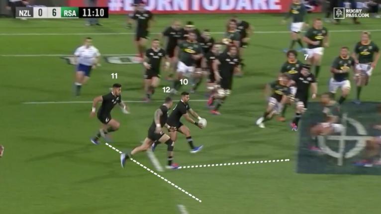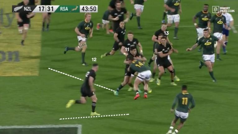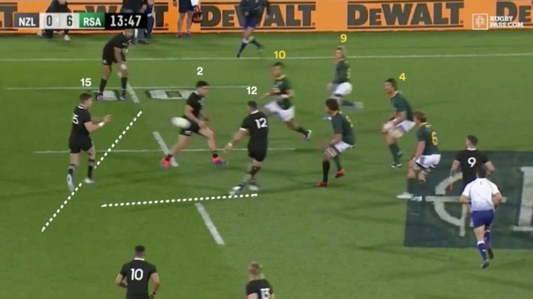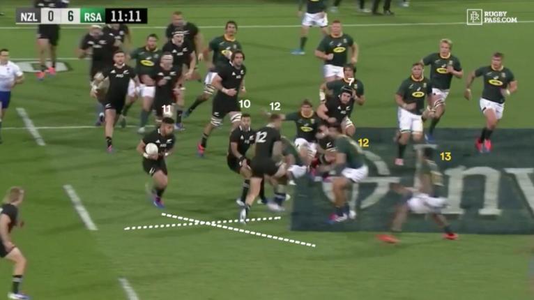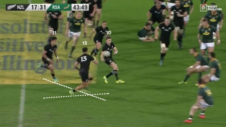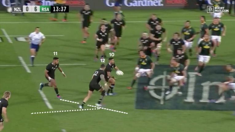 In last year’s test, Beauden Barrett plays Rieko Ioane out the back who crashes into winger Jesse Kriel (playing centre at this stage), while Ryan Crotty (12) offers a late support line.