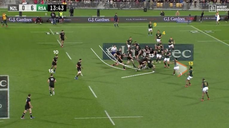 Faf de Klerk also has Rieko Ioane covered on the outside and the All Blacks are unable to create an overlap to exploit.
