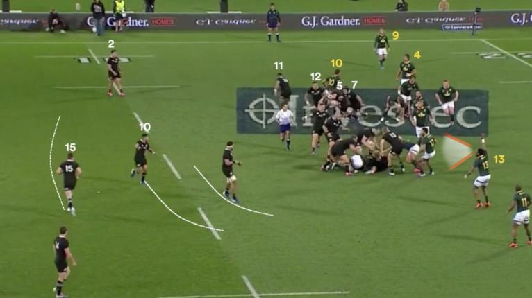 Just as Damian McKenzie (23) and Beauden Barrett (10) appear to move towards the left side, a host of Boks fold around the corner to defend the other side.