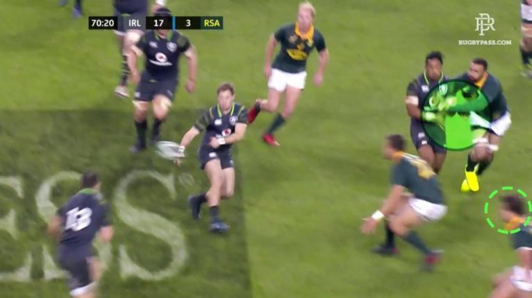 The Irish midfield is going to running decoy lines (highlighted green) that will draw their opposite defenders in with them. In Aki’s case, his extreme angle will pull his opposite Handre Pollard (22) as far as he can before running into South Africa’s flanker.