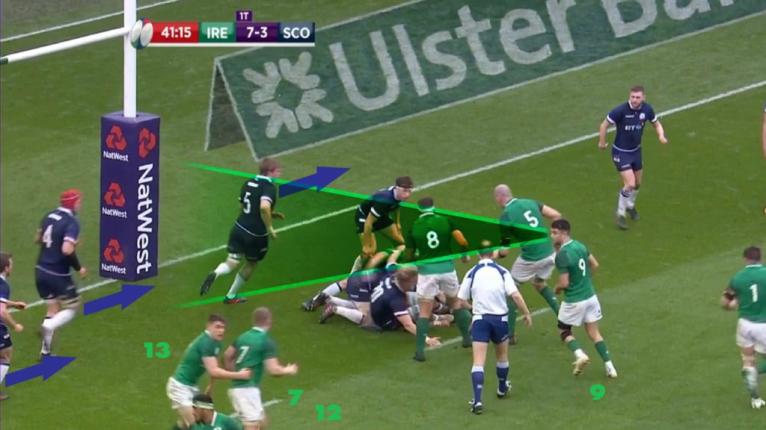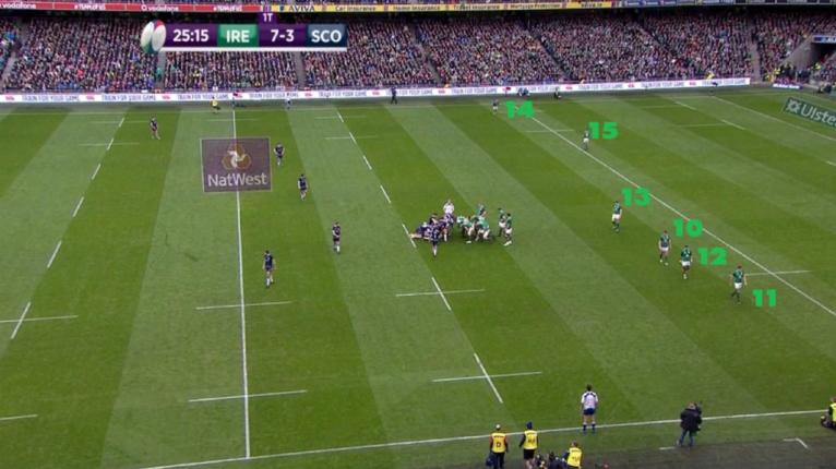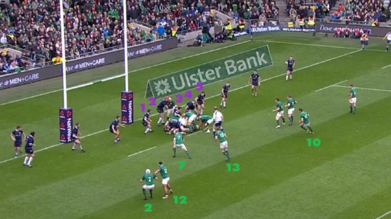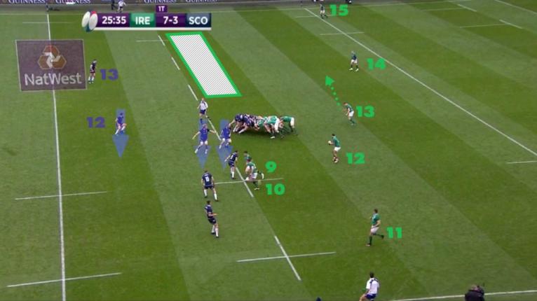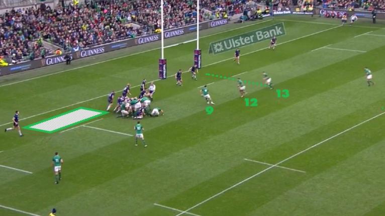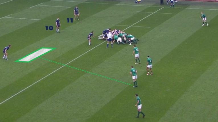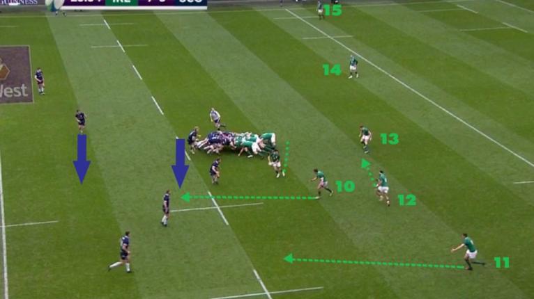 Ireland load the short side with four players, one directly behind the scrum. Scotland is forced to bring an extra defender across leaving acres of space on the open side.