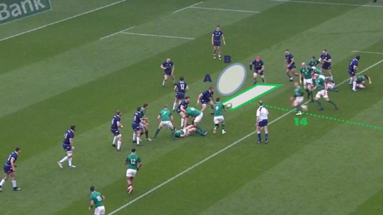 Conor Murray switches play rapidly on a pet play with blindside winger Earls (14) on the burst attacking the vacant ‘B’ defender channel. Earls makes a half-break across the gain line but the Scottish defence is able to close in just in time to avoid getting knifed on the switch play.