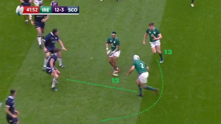 The lure of Sexton (10), the regular first receiver, setting up to the right lulls Scotland into thinking Ireland will continue that way. Ringrose is rarely a first receiver in Ireland’s structure, with Sexton and Aki the usual options. This plays a part in the deception of this play.