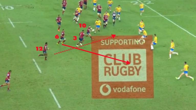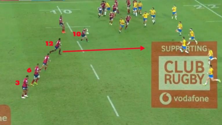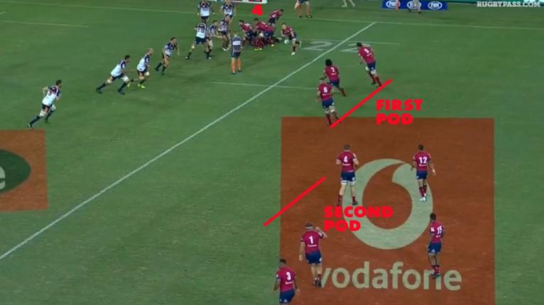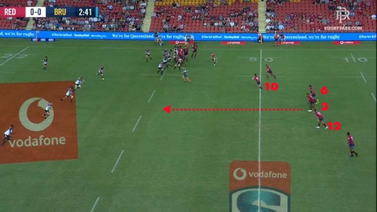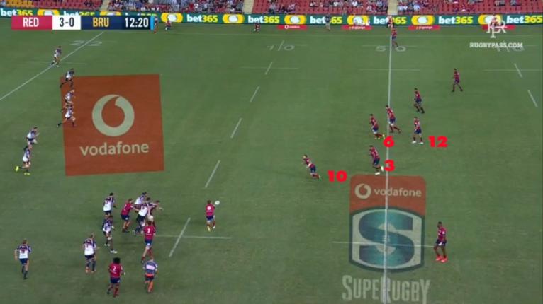 The Reds have used a number of 4-man and 5-man lineout packages to allow Tupou to be placed in the back line. Their typical setup is three ball carriers outside 10 for a midfield crash.