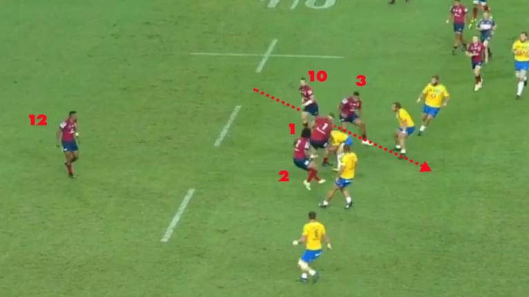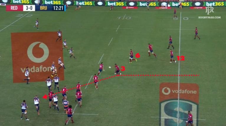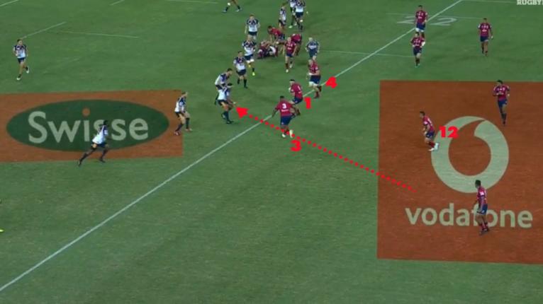 Here the Reds have Tupou as the second running option outside 10, and below as the first running option. They run a 1-2 cut as if Tupou was playing inside centre.