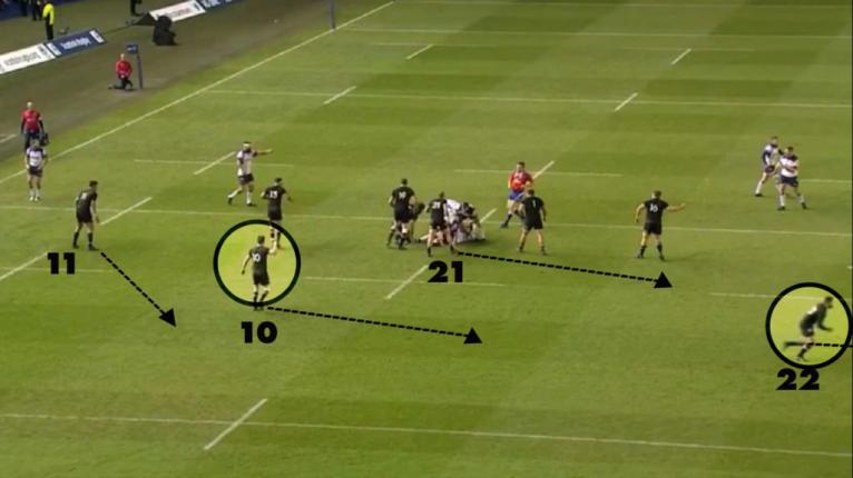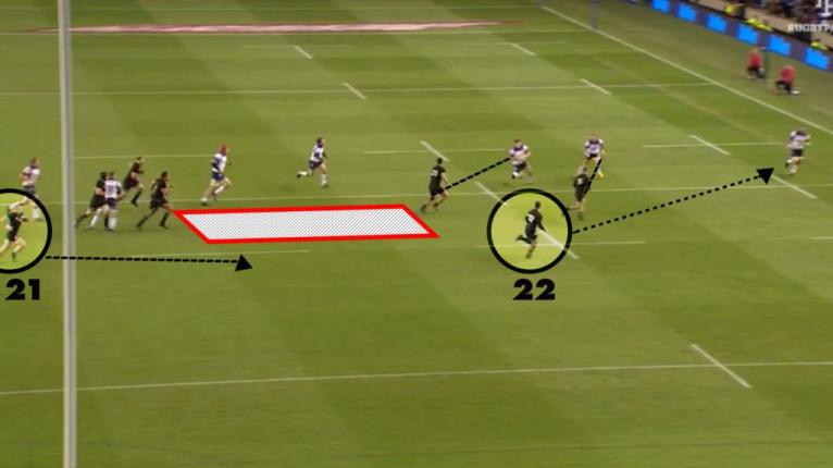 With less than a minute remaining the All Blacks are in ‘close out’ defence structure – playing with two fullbacks back (both kicking options) and both wingers up in the line.