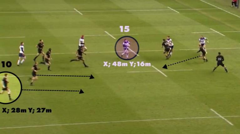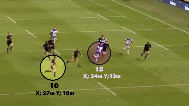 When Hogg hits the ball he has 48 metres to run to the try line. He only has 16 metres to use between the sideline, while Barrett only needs to run 27 metres to reach the sideline.