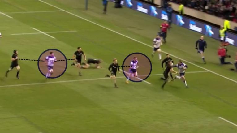 The only other way Scotland scores directly off the break is if Hogg kicks a deft grubber in-field of the left foot as Barrett tackles him, leaving it up to a foot race between support runners and the bounce of the ball.