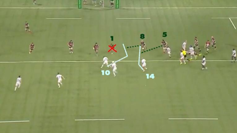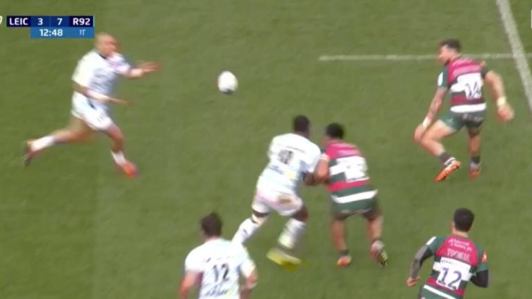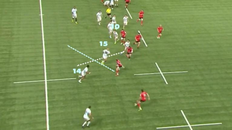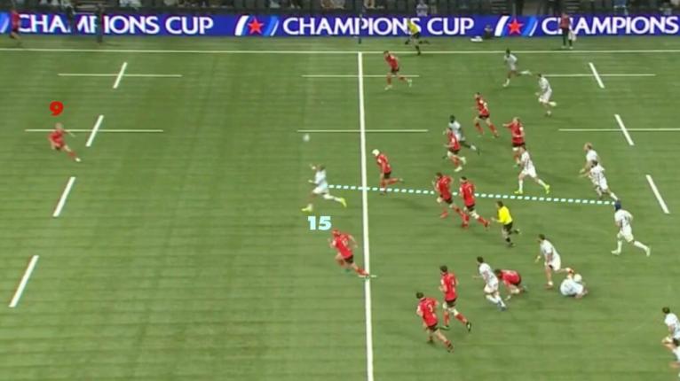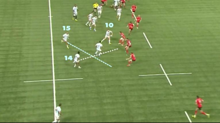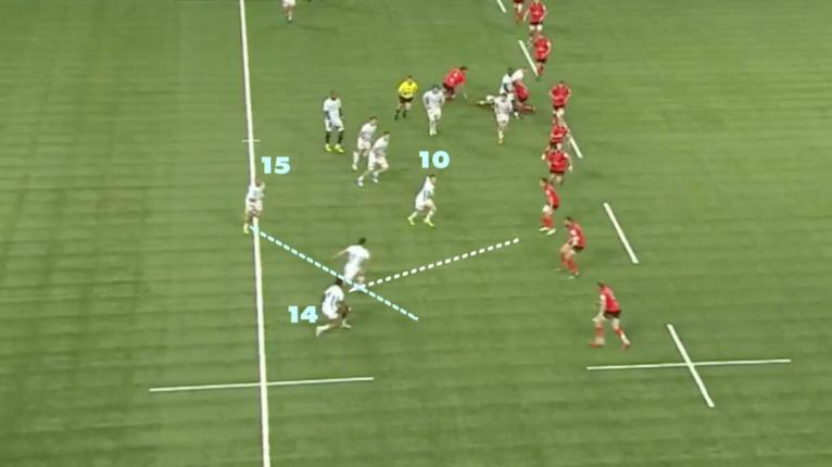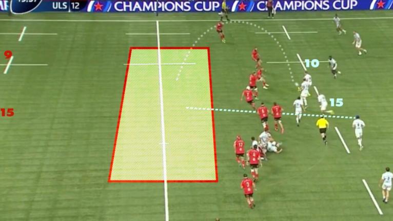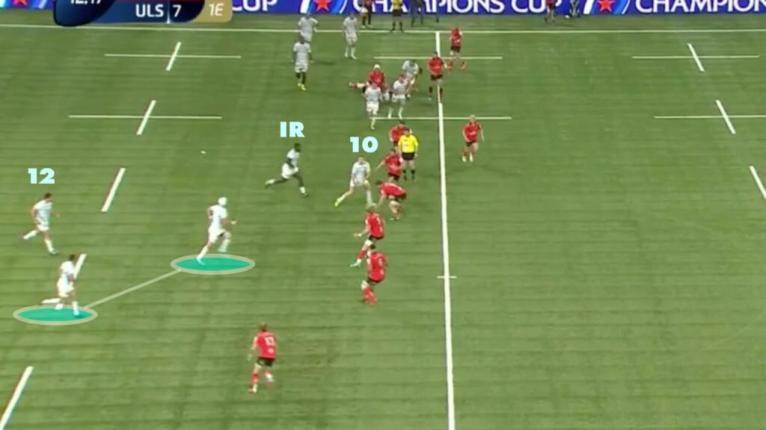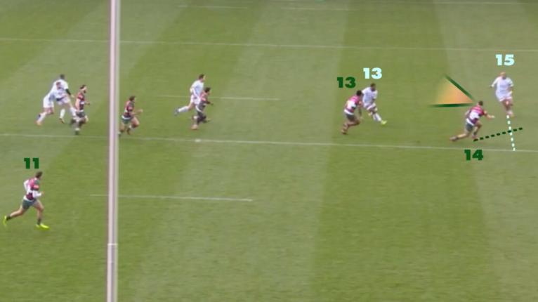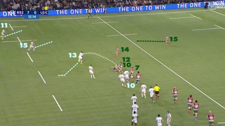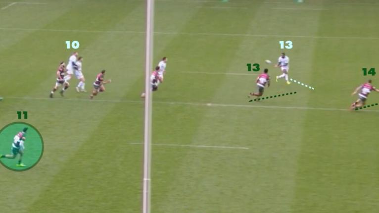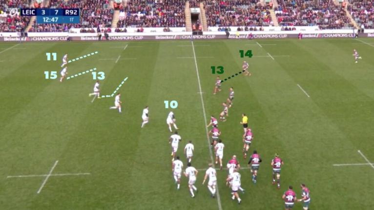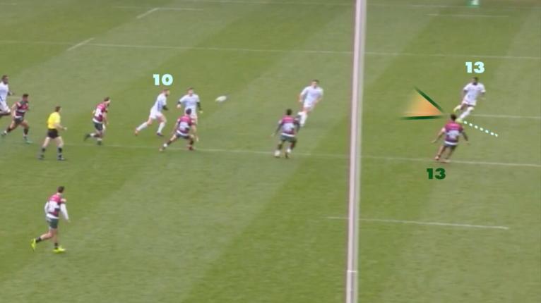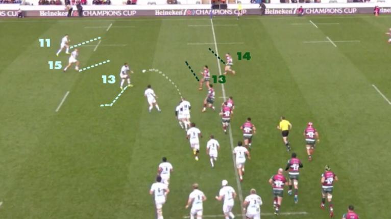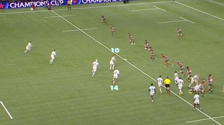Tuilagi is ball watching inside, which is going to delay his ability to react to the change of angle by his man, giving Racing the slight advantage they need.