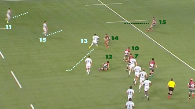 Firstly, Leicester has to change into a slide defence in order to recover which requires the Tigers’ outside backs to make secondary decisions, which could cause disconnection.