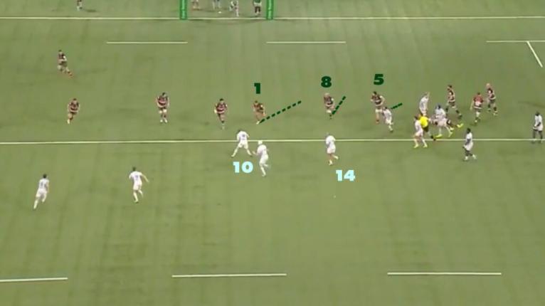 Russell beats Genge one-on-one cutting back off the left and now puts serious pressure on Sione Kalamafoni (8) and Harry Wells (5) to push across and cover two backs.