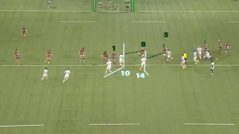 Against Leicester they successfully used this simple set-piece play around their two weapons, using the speed of Russell’s pass and Zebo’s line running to expose Leicester’s fragile edge.