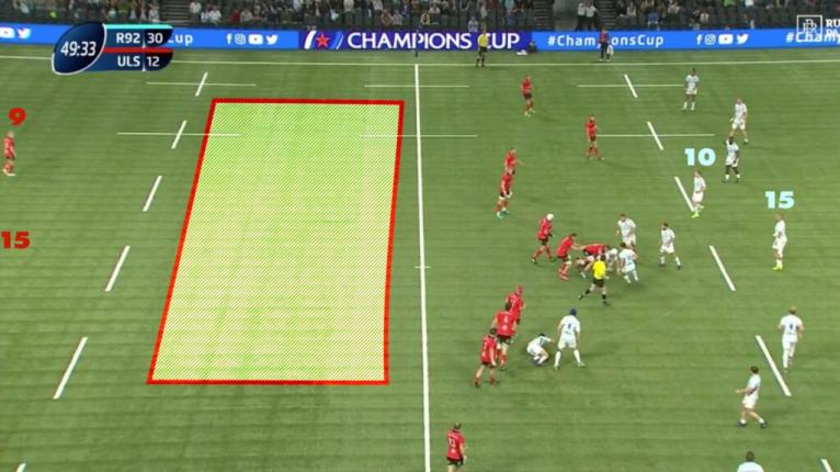 Secondly, Russell’s bullet pass has created Racing’s width so quickly it has put Jonny May behind the 8-ball on his sweep coverage route coming across in the backfield.