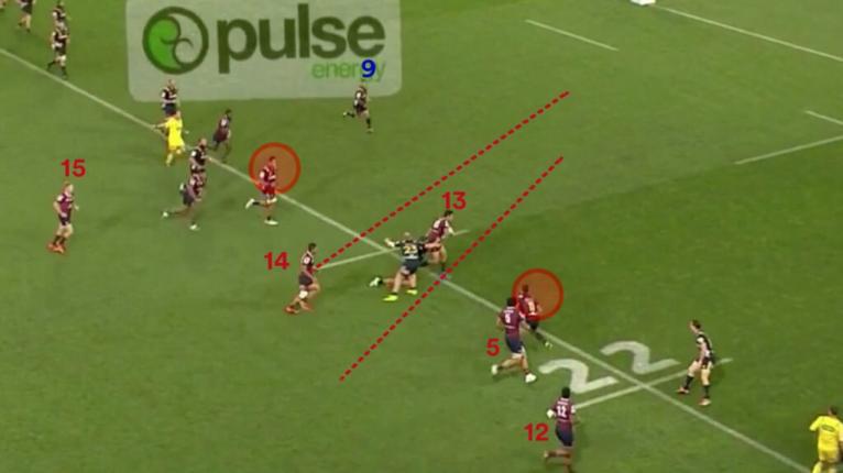 With Smith having to stop, turn and re-accelerate, a winger with pure speed would likely be able to bypass him and stay a metre or two in front and finish this opportunity off. As Li ultimately runs Petaia down, there are no flat options inside or outside that would result in a sure seven points with an offload.