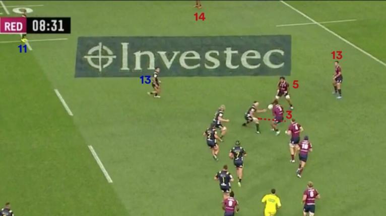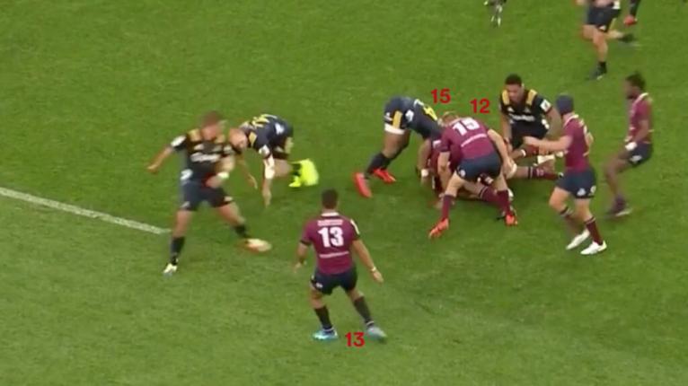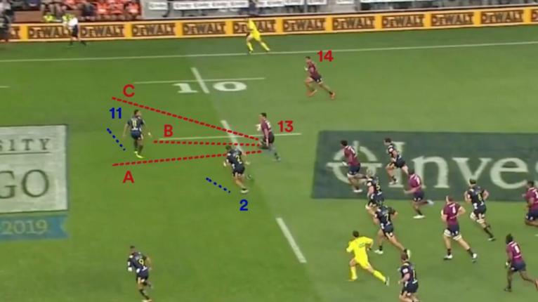 With Tevita Li (11) turned out, backtracking to buy time, Petaia has three running options, a) cut back and take on the trailing hooker on the inside, b) run at Li, draw and pass to free Chris Feauai-Sautia (14) on the edge or c) take Li on the outside himself.