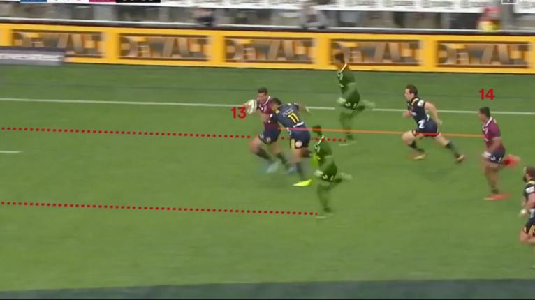 This midfield partnership has the potential to open up many backlines this season once they build chemistry and Petaia can become the benefactor. On Kerevi’s first carry off set-piece he slips the tackle of Dillon Hunt (7), defending at flyhalf, and begins to suck-in everyone else.