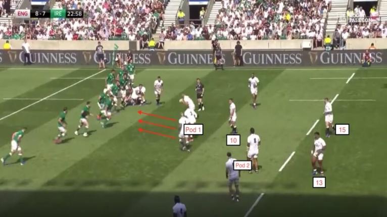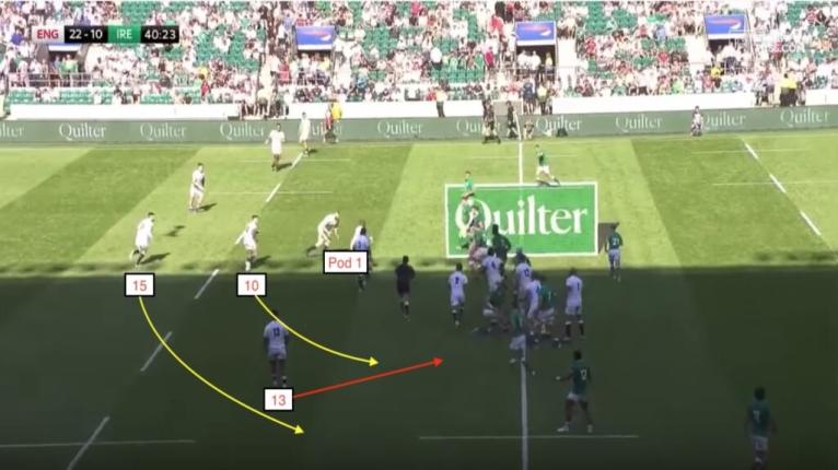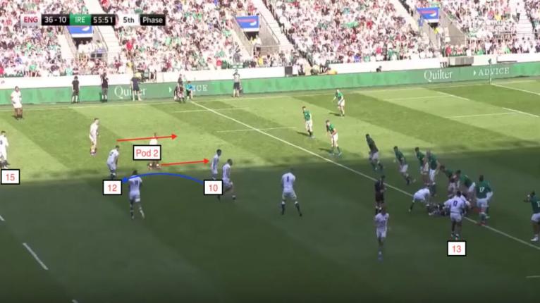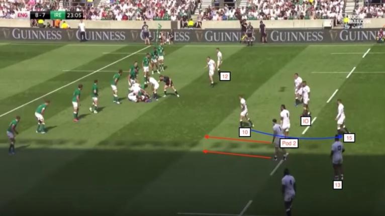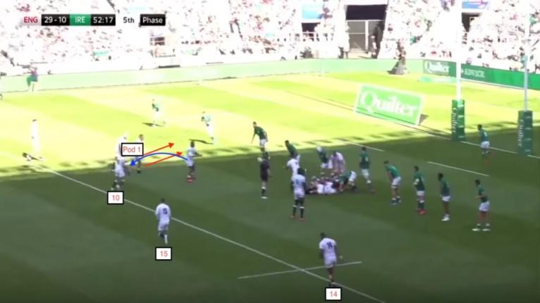 As an example, we see England here about to execute the wide receiver. All the playmakers are on the left, Tuilagi is ready, yet Ben Youngs switches quickly, to the ‘one out’ pod.