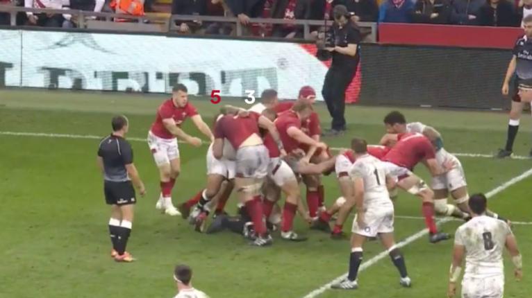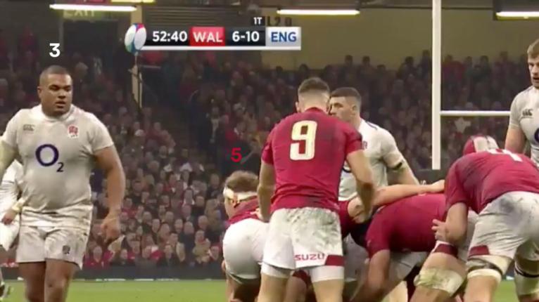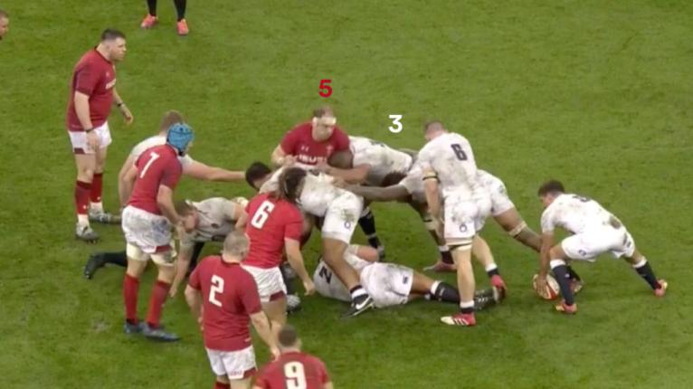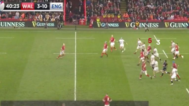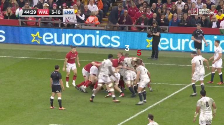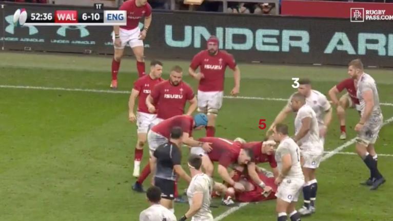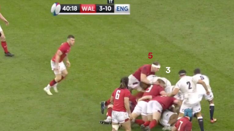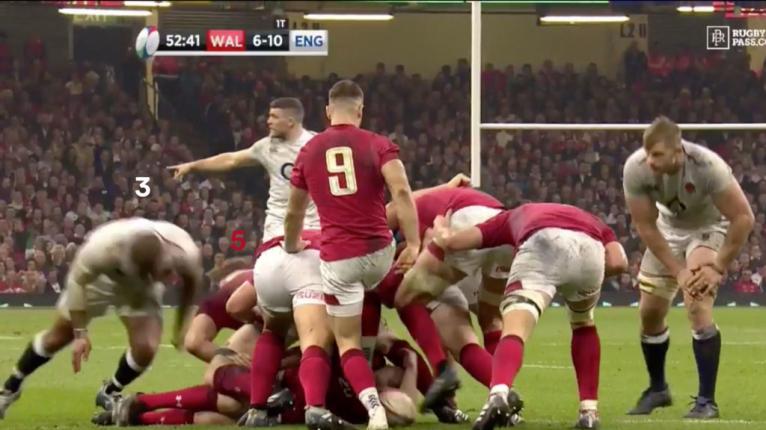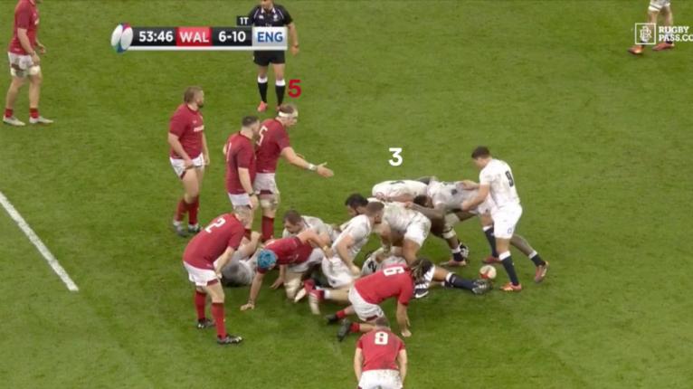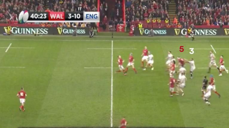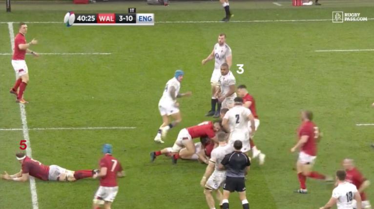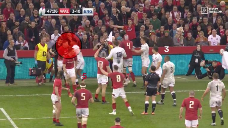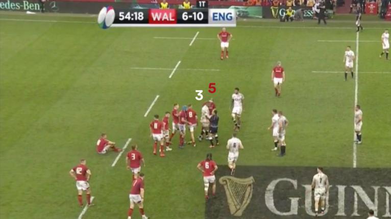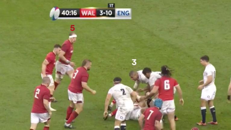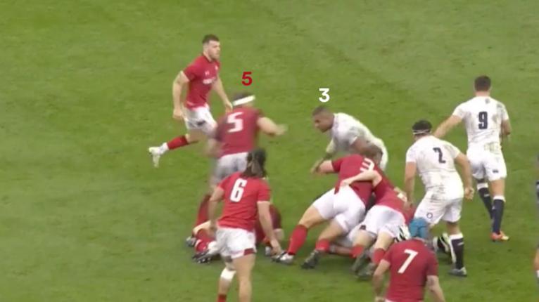 Jones (5) is able to bail on the ruck just as quickly, retreating as part of Wales’ transition into attack, having successfully ‘poked’ England’s prop quickly and moved on.