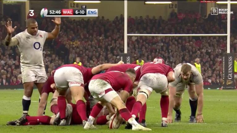 From England’s subsequent kick-off, Wales prepare to exit with a box kick. Jones is protecting the ruck and he is seen watching Sinckler like a hawk.