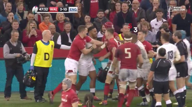 Neither player is particularly close to the scuffle, but Sinckler (3) goes in to pull Liam Williams off his teammate, while Jones just goes straight for Sinckler to antagonize him.