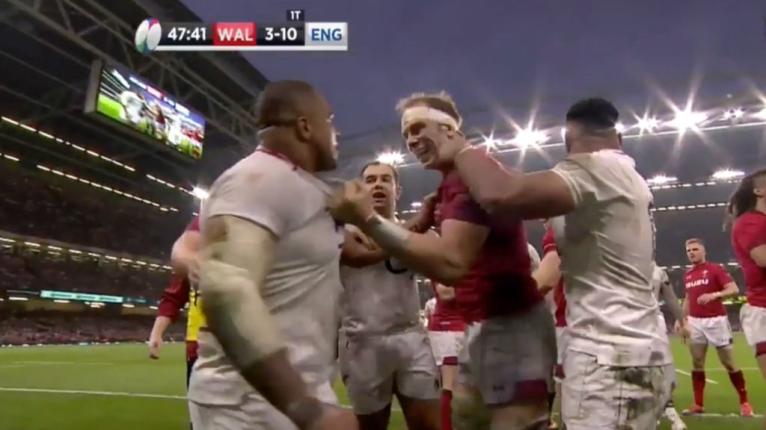 Jones pushes Sinckler backwards while getting in his face, trying to incite some offence that would see England get punished.