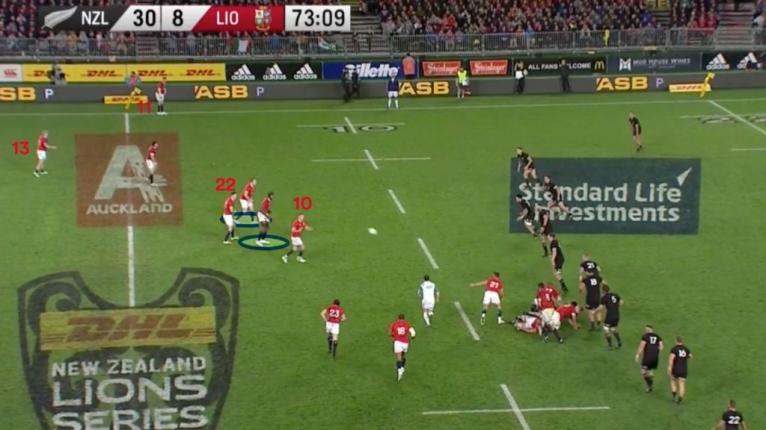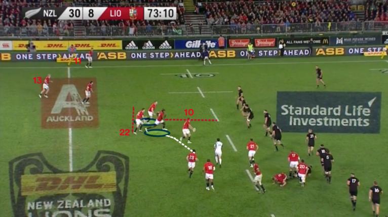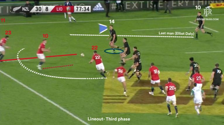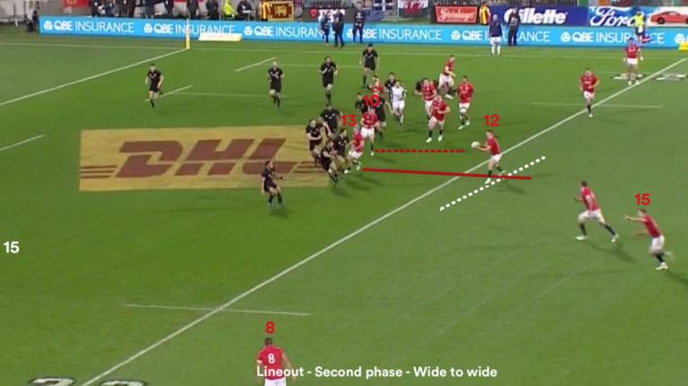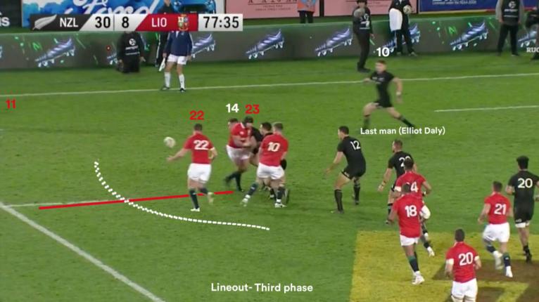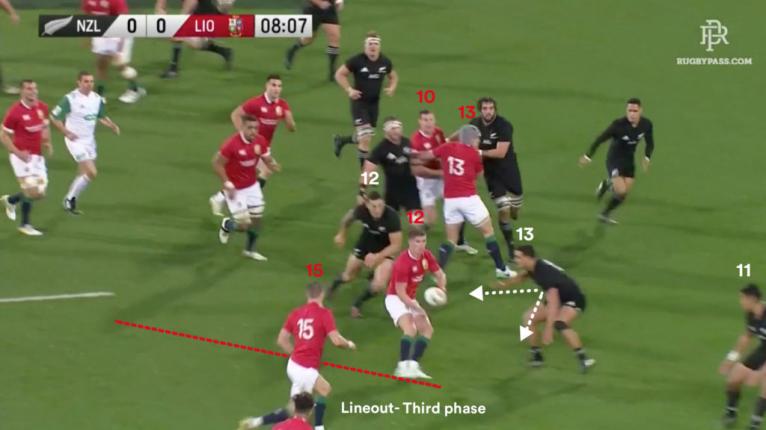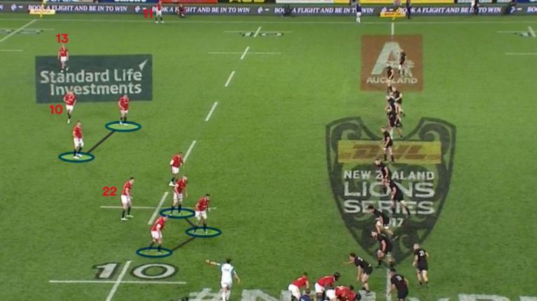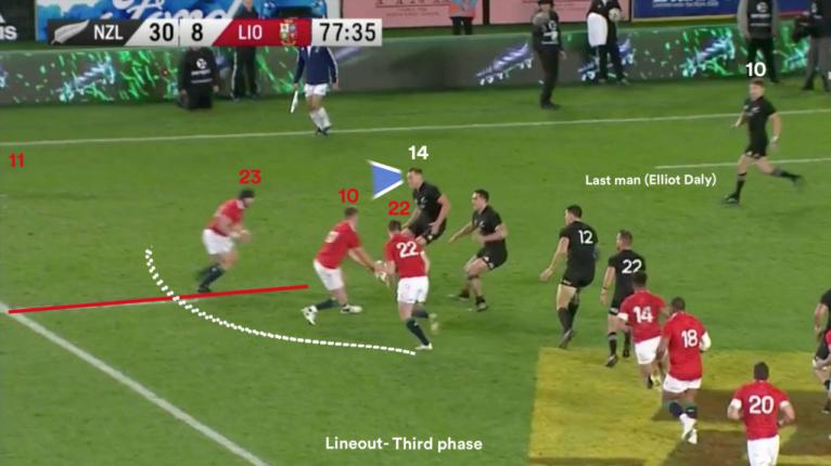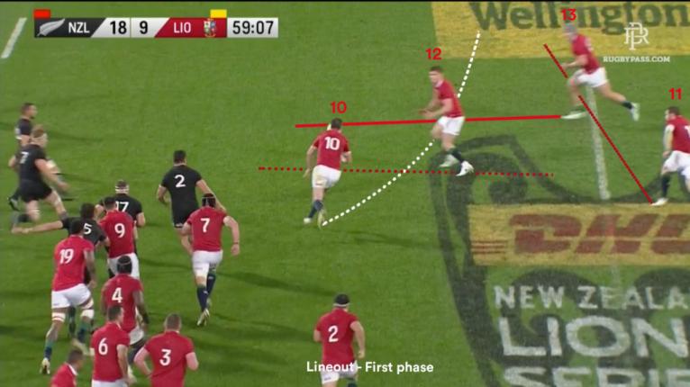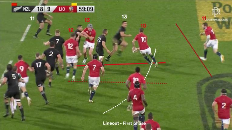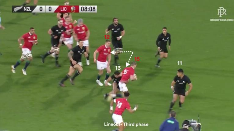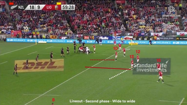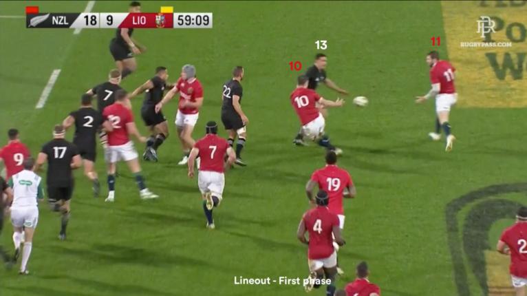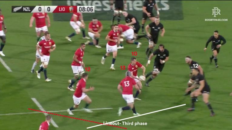 After two phases, the entire Lions’ backline (minus Davies) is present for a strike play on the right edge with Elliot Daly (11) linking from the opposite wing.