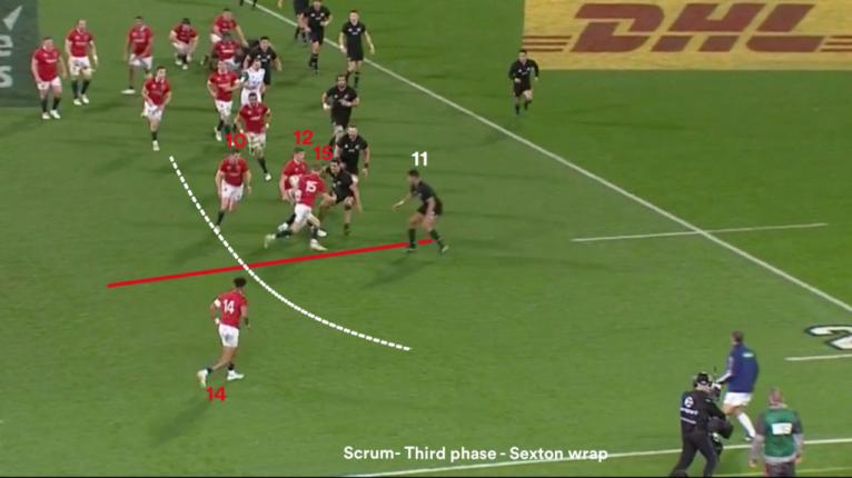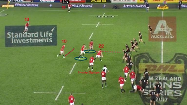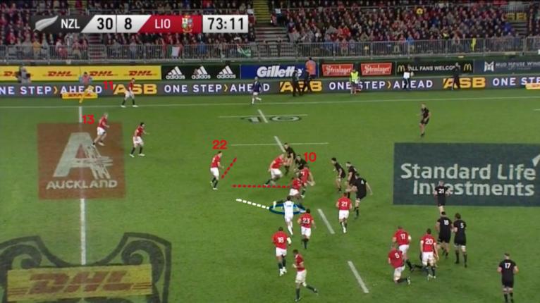 With Dagg playing ‘man defence’ on the edge, if Halfpenny (23) can hold or get Dagg to initiate contact with his line, Sexton (22) on the wrap-around can potentially get outside the All Black winger, creating a two-on-one against Beauden Barrett (10).