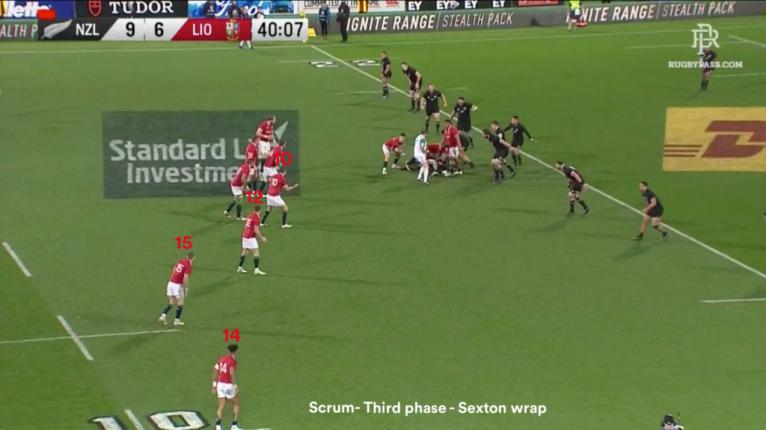 The general phase play pattern with Sexton on the field was the same one used by Ireland, consisting of one pod of three forwards off 9 and a central two-man pod with another game driver in behind, Owen Farrell (10).