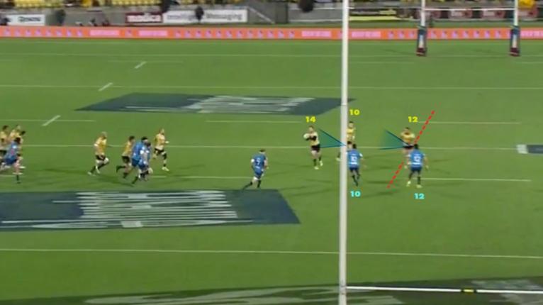 The Blues up-and-in defence was exposed by the Hurricanes using Laumape’s ‘unders’ lines to fly under the radar. The Blues backs align inside the opposite man, instead of body-on-body, and push up and out to force the attacking side towards the sideline.