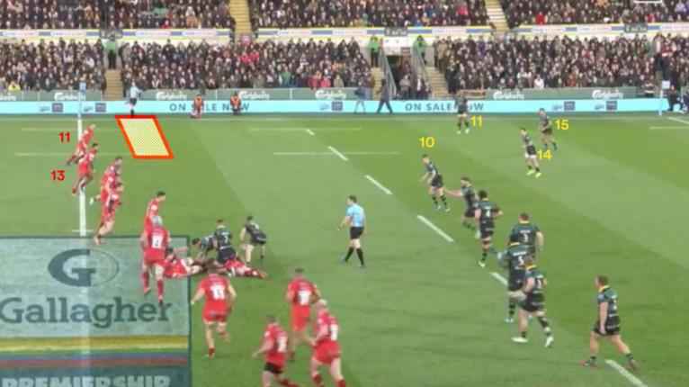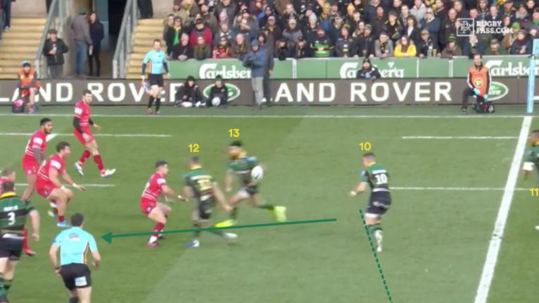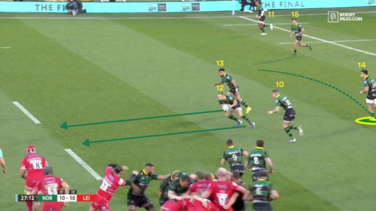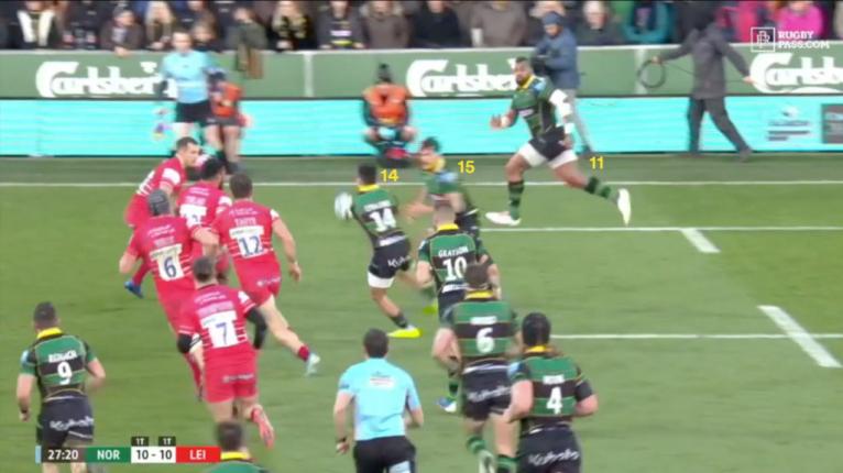 On the next phase, Northampton isn’t waiting for forwards to track around and carry around the corner. They know they have speed and quick handling skills available with 10, 14, 15 and 11 in succession towards the right edge.