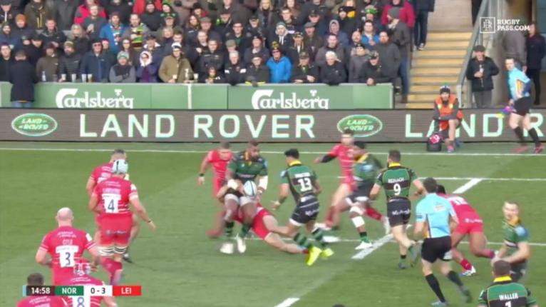 Northampton breaks the line and are eventually brought down a few metres short of the line. On the next phase, the Saints score in the corner with the defence still scrambling.