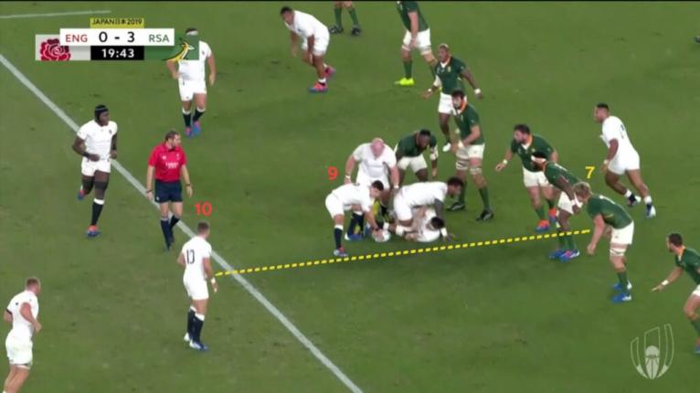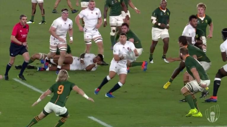 In this case, Youngs plays back left the other way to Owen Farrell looking to expose South Africa back where the lineout took place.