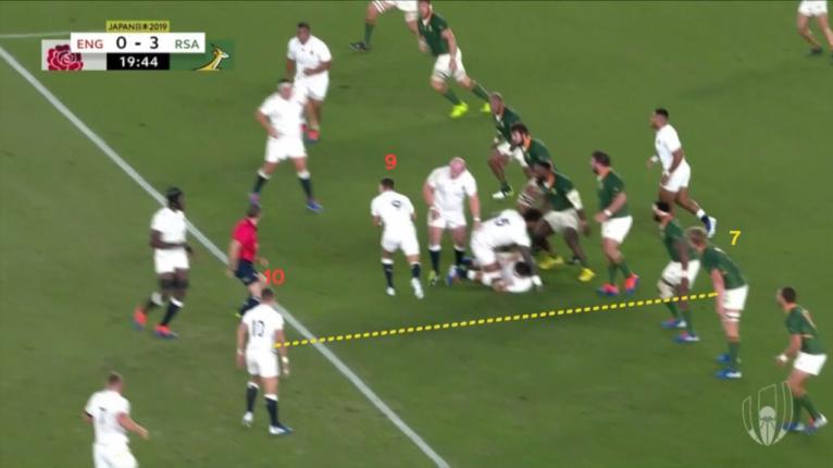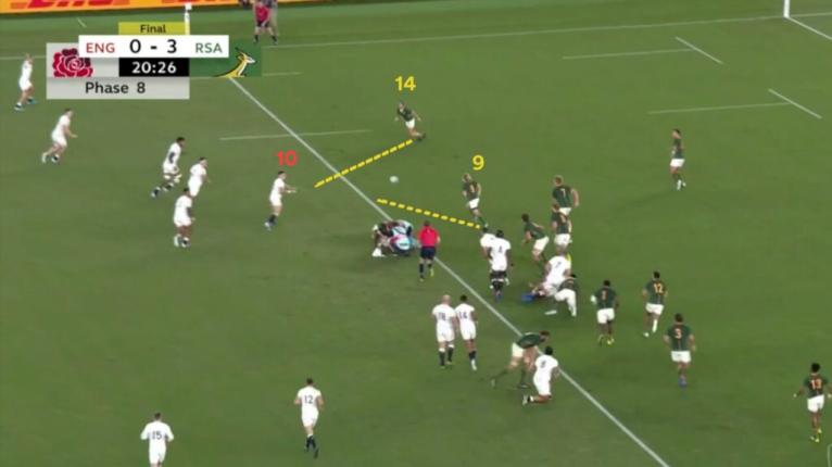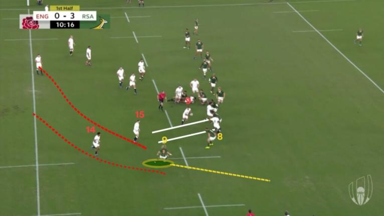 Faf de Klerk (9) is folding from the opposite side of the ruck while Cheslin Kolbe (14) makes a calculated gamble to shoot up to try and close down the play.