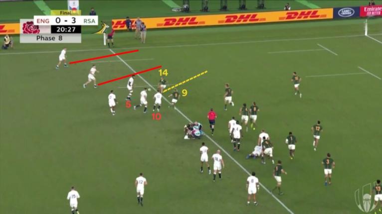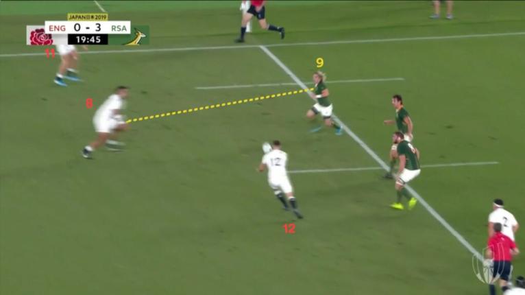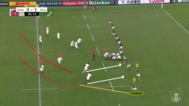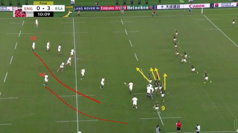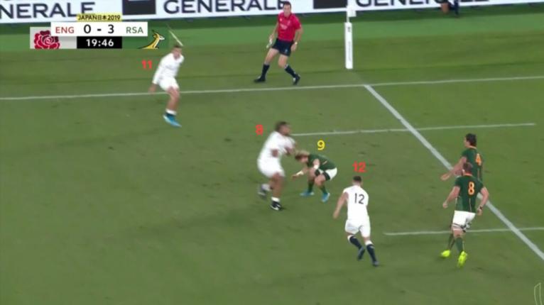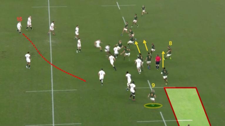 With the Springbok tight five pushing out from the lineout towards the midfield, England uses the speed of Elliot Daly (15) and Anthony Watson (14) to create an overlap down the right-hand side.