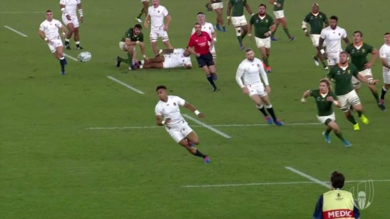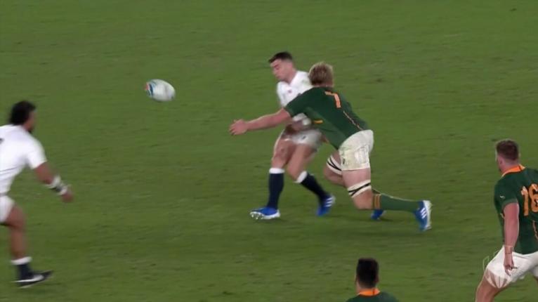 Again Faf de Klerk is the last defender and makes another crucial spot tackle on a much larger Number 8, Billy Vunipola, preventing the free man Jonny May (11) from getting the ball.
