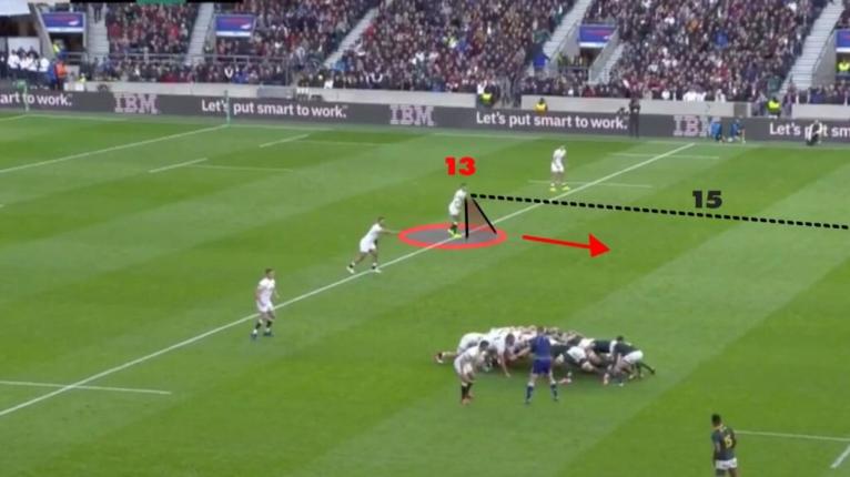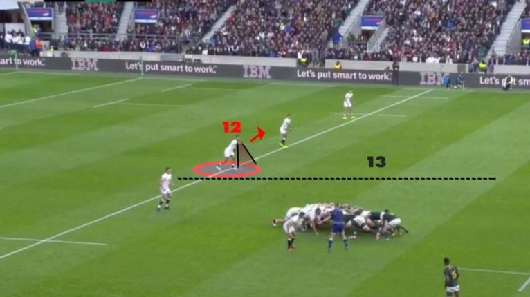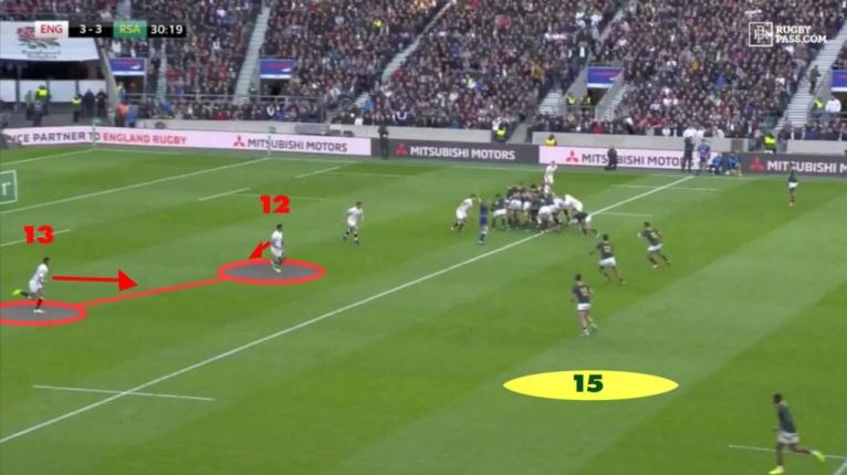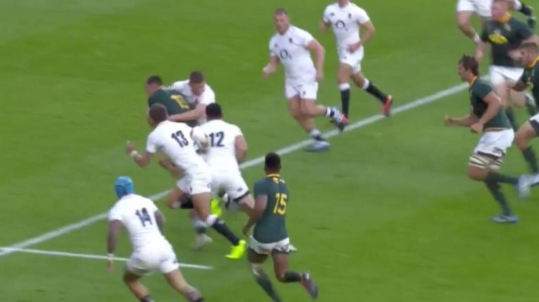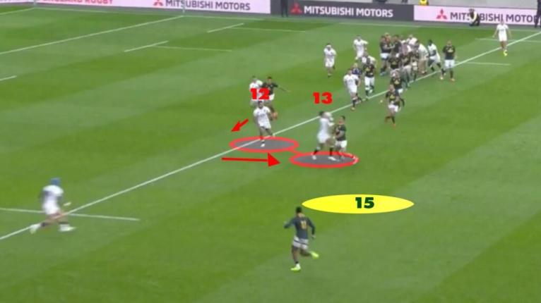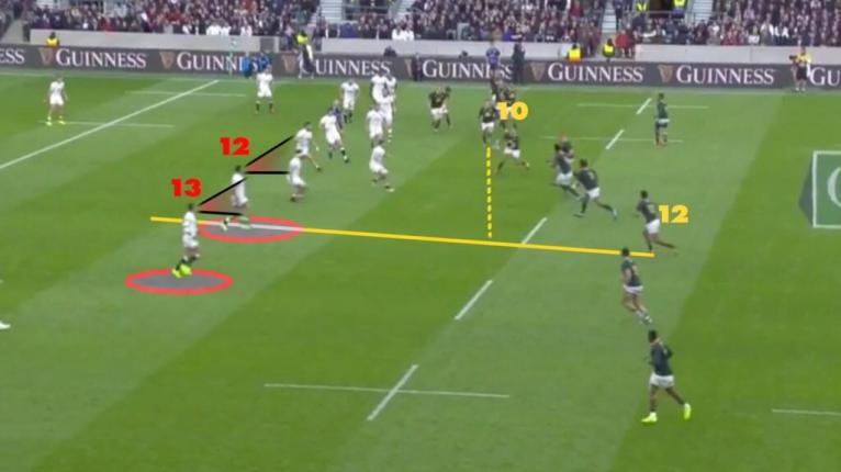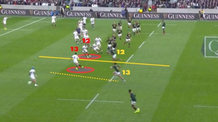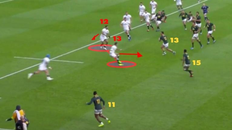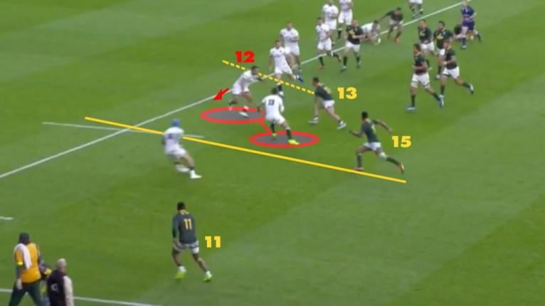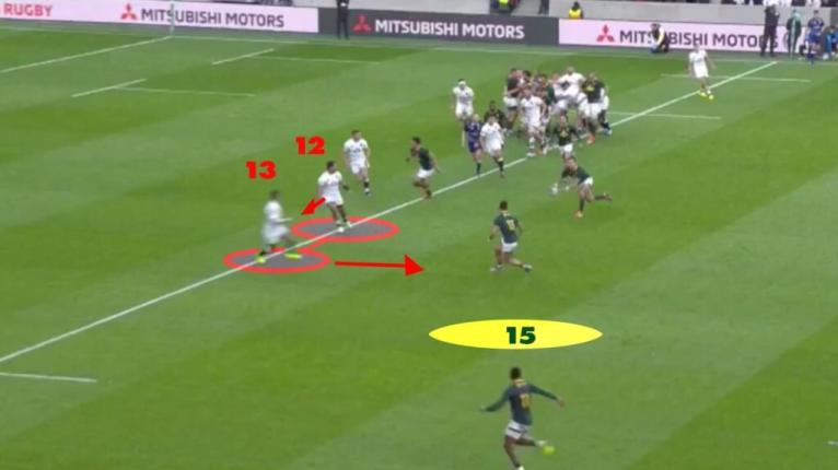 For some unknown reason, fullback Damian Willemse has taken himself out of the back line, dropping deep despite his side having the ball. If he had been up in the line, England would’ve been potentially in trouble on the edge.