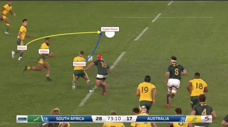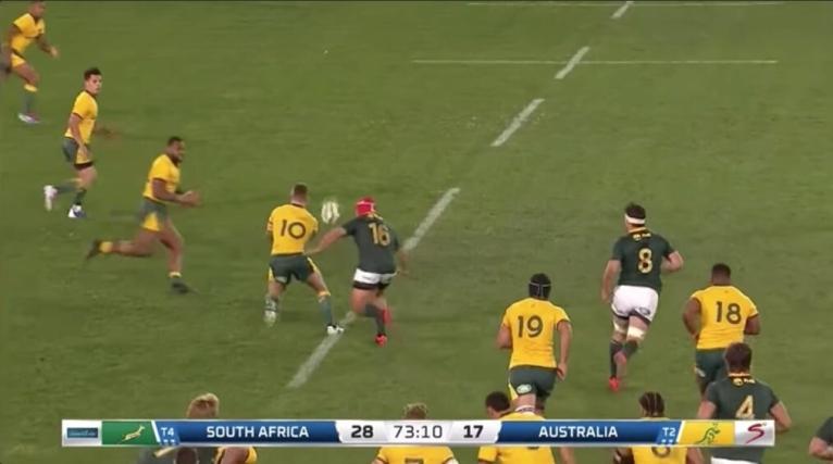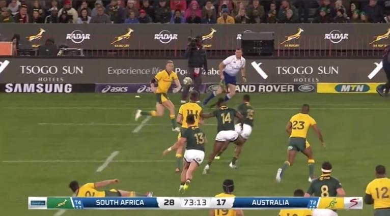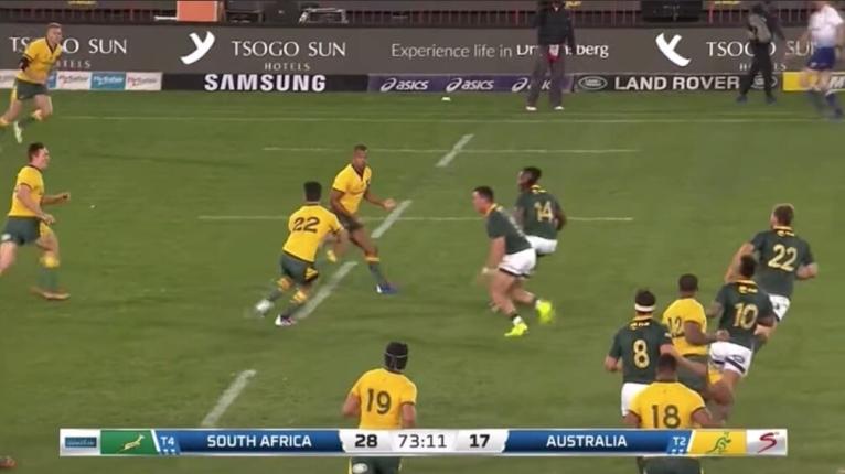 The ‘world class’ variation by the Wallabies succeeded in getting the last man Reece Hodge unmarked, with fullback Warrick Gelant seen covering Dane Haylett-Petty one man in.