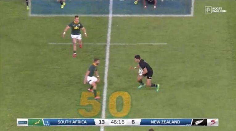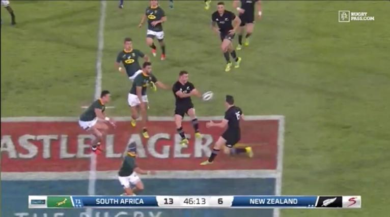 The New Zealand sweep play is well-handled by the Springboks, and doesn’t succeed in creating an overlap on the edge.