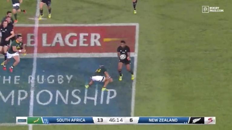 Against New Zealand, Jesse Kriel is able to get over to handle the decoy runner, clarifying Kolbe’s role as the ‘catch up’ defender.
