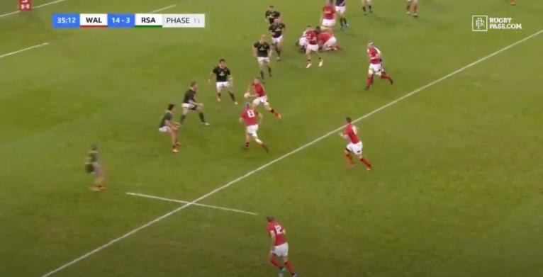 With league defence, the tries dried up, leading to the years of kick-tennis that we saw combined with the experimental law variations. The result is that modern defences are specifically designed to nullify these attacking shapes, as shown by South Africa shutting down Wales’ “slice” play below.