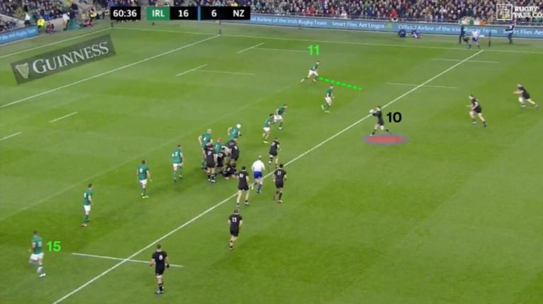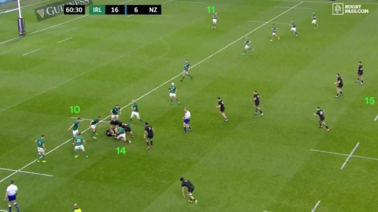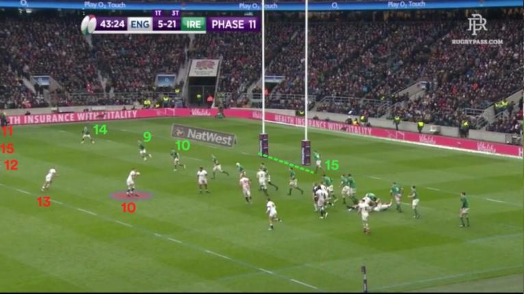 Ireland only has Keith Earls in the backfield, trying to recover back to the open side, with no wingers in support coverage. Both Kearney (15) and Stockdale (11) are stuck at the bottom of the ruck.